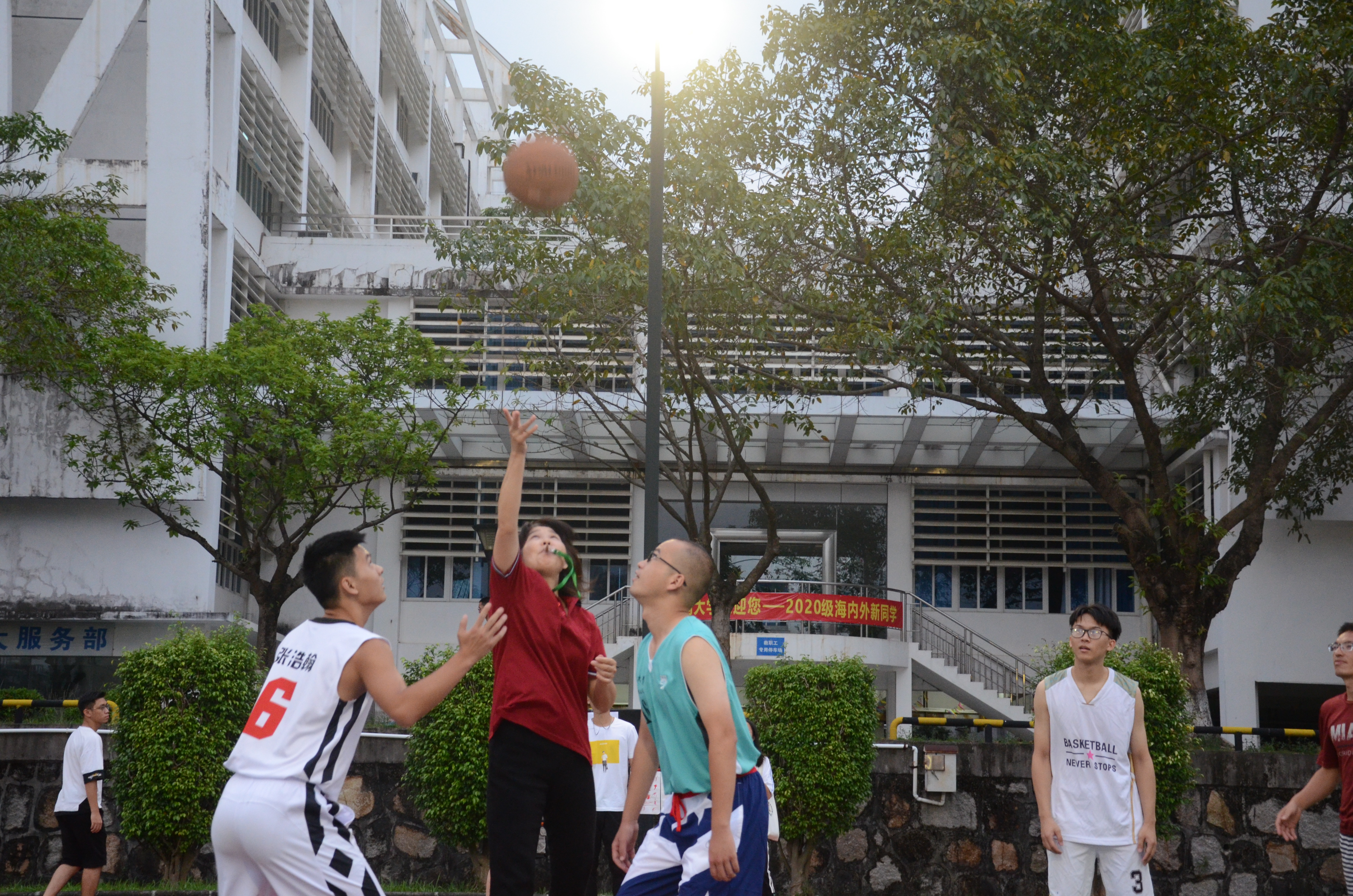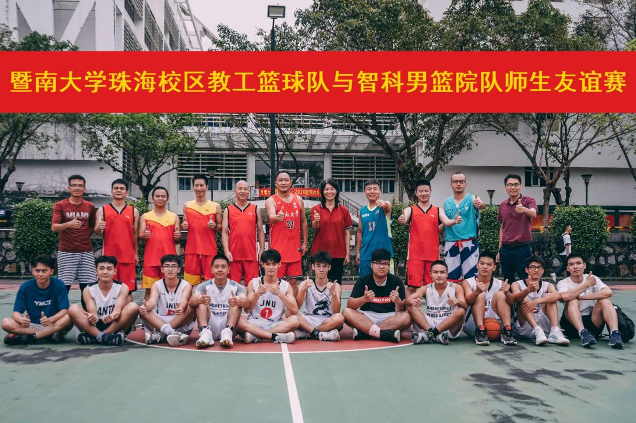 学生男子篮球队在校区篮球场成功举办师生篮球友谊赛。