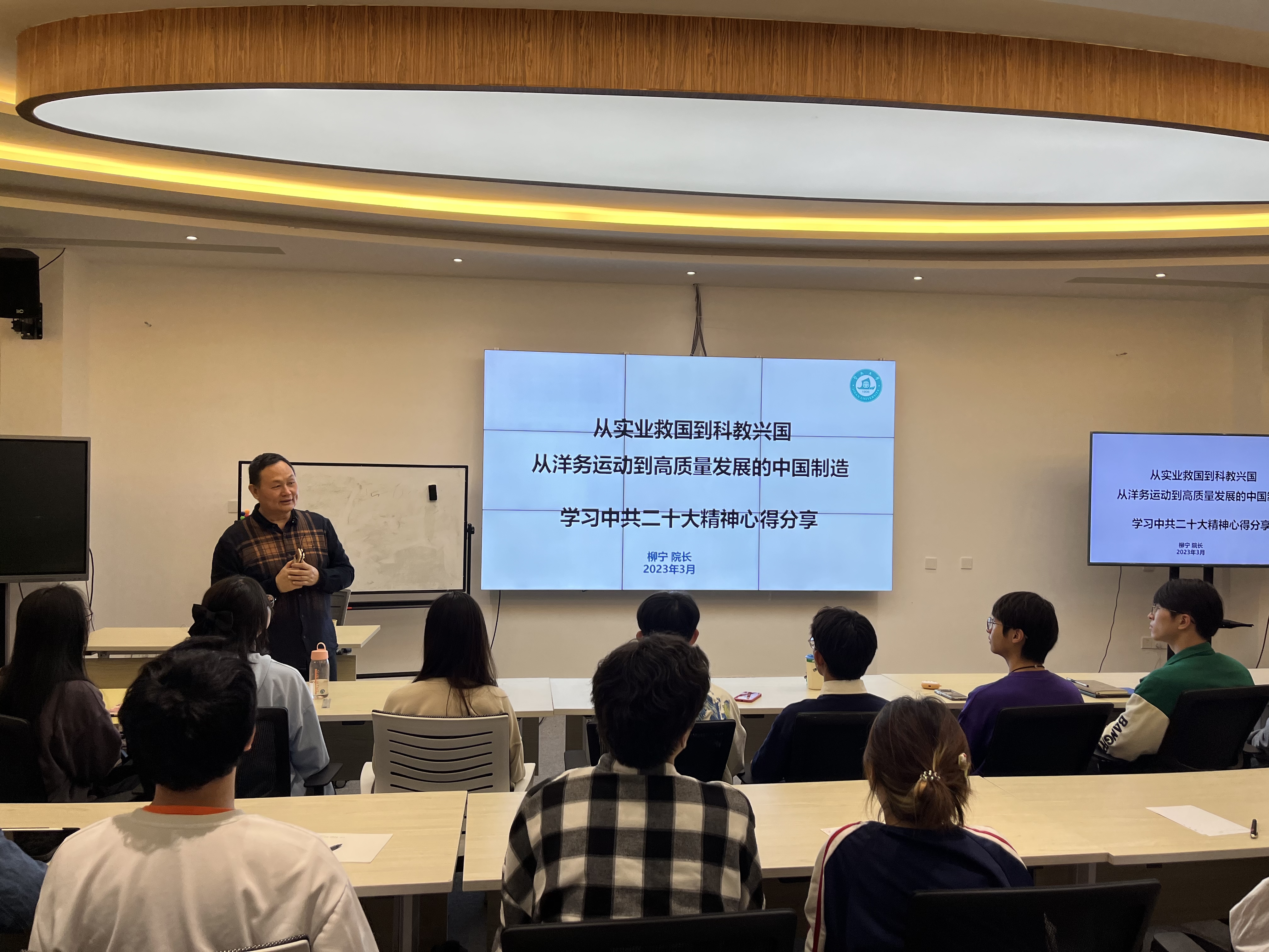 2023年3月8日晚,搜同 /人工智能产业搜同 在实A305会议室举办学习宣传贯彻党的二十大精神专题“思政第一课”,搜同 院长柳宁教授以“从实业救国到科教兴国,从洋务运动到高质量发展的中国制造”为主题作报告,搜同 第90期发展对象及部分学生干部共50人聆听了报告。