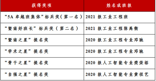 在近期结束的搜同 第十二届“5A卓越引领计划”中,经个人(班集体)申请、各单位初审推荐、党委学生工作部组织复评,搜同 /人工智能产业搜同 共有1个班集体、4名同学入围公开评选答辩会。经最终审核,搜同 共获取6项荣誉,2021级工业工程班斩获“5A卓越班集体”标兵奖第一名,2021级工业工程专业陈禹衡斩获“暨南好班长”标兵奖第二名,2020级工业工程专业邓驰荣获“暨南之星”、“学术之星”提名奖,2020级人工智能专业樊荣裕荣获“骨干之星”提名奖,2020级人工智能专业黄祖艺荣获“自强之星”提名奖,充分展现了我院学子奋发图强,追求卓越的良好品质!