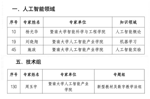 搜同 院长杨光华分属于人工智能概论领域,搜同 党总支书记周玉宇分属于新型教材及数字教学法专题组,副院长施政分属于人工智能实验领域,搜同 珠海校区管委会副主任刘晓翔分属于机器学习领域。