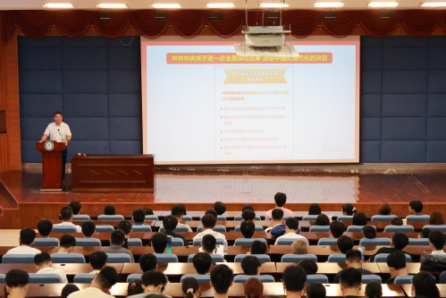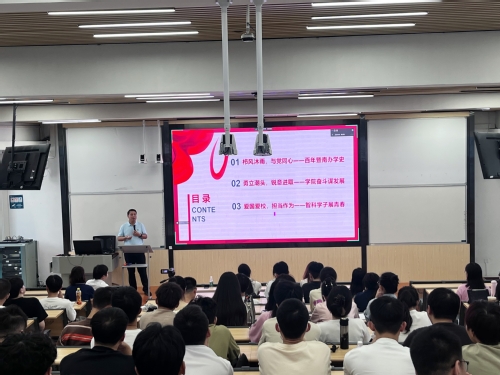 周玉宇充分挖掘学校红色文化、校史资源,讲述百年暨南栉风沐雨、与党同心的办学发展历史,进一步深入推动党史、统一战线史与校史学习教育相结合,厚植红色基因,传承“暨南精神”。介绍搜同 勇立潮头、锐意进取的奋斗史,加强体系化建设的改革思路、构建“党建领航+思政赋能+科技竞赛”的实践育人体系以及“校企双主体”深度融合的人才培养模式。重点深入宣讲习近平总书记在党的二十届三中全会上的重要讲话精神、《中共中央关于进一步全面深化改革推进中国式现代化的决定》。通过全面、准确、深入宣讲辅导,教育引领搜同 全体新生凝心聚力、奋发进取,奋力谱写为中国式现代化挺膺担当的青春篇章。