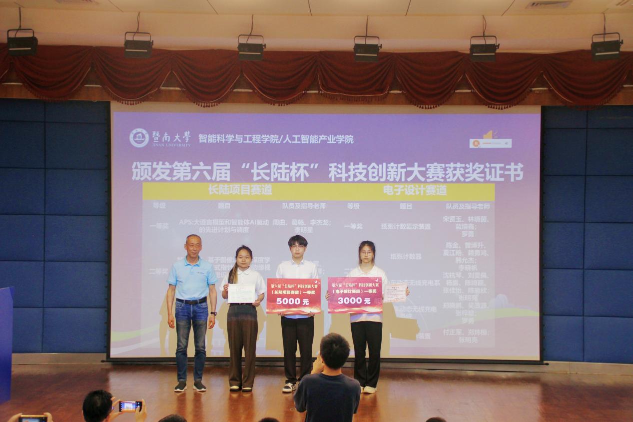 长陆公司副总经理项进解、杜洪涛给第六届“长陆杯”科技创新大赛获奖(电子设计赛道、长陆项目赛道)队伍颁发证书。现场同时颁发了科技创新部优秀部员证书、单项比赛表现突出优异奖证书、学校学术科技竞赛表现突出贡献奖证书、校内外指导老师聘书以及科技竞赛优秀指导老师证书。