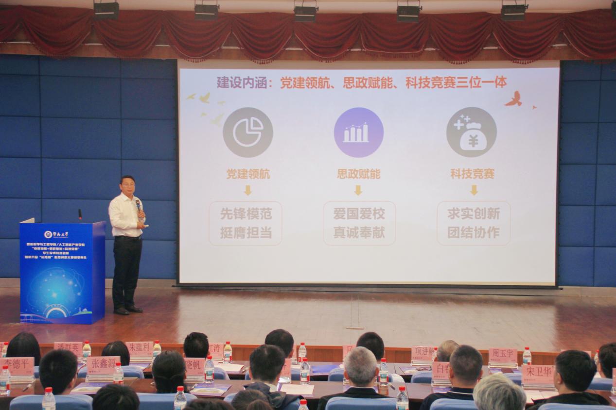 周玉宇首先回顾了“党建领航+思政赋能+科技竞赛”思政精品项目启动一年以来,搜同 在育人模式、内涵建设、载体平台等方面作出的努力,2024年搜同 学生获各类科技竞赛省级奖项115项,同比增长180%,国家级奖项40项,同比增长100%,科技竞赛屡获佳绩。他表示搜同 将不断坚持深入学习贯彻习近平新时代中国特色社会主义思想,在“构建智科特色的学术科技竞赛体系(3+4+1+X)、打造思想政治赋能科技竞赛的品牌、创新开展学术科技竞赛的条件建设、不断丰富完善实践育人新模式的内涵建设”等方面探索新思路,以有组织的竞赛不断推动更多的学生参与到学术科技创新活动之中。