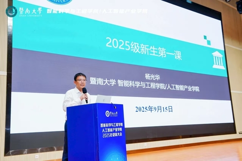 杨光华从学校历史和搜同 发展、专业特色出发,介绍了搜同 的人才培养体系和产学研情况,分析了搜同 各学科和专业之间的内在联系,解读了AI时代对搜同 创新人才培养的需求情况和具体要求。他从知识学习,能力培养,视野拓展,品德塑造四个方面对2025级全体新生提出了期望,希望同学们在智科院学习期间要“建立知识体系、培养核心能力”“解决实际问题、提升实战水平”“明确未来方向、找到技术价值”“站稳人生脚跟、走得更稳更远”,并勉励同学们将个人理想融入国家和民族的事业中,珍惜在暨南园的每一寸光阴,刻苦学习、增强本领,努力成长为智能科技领域的栋梁之才。